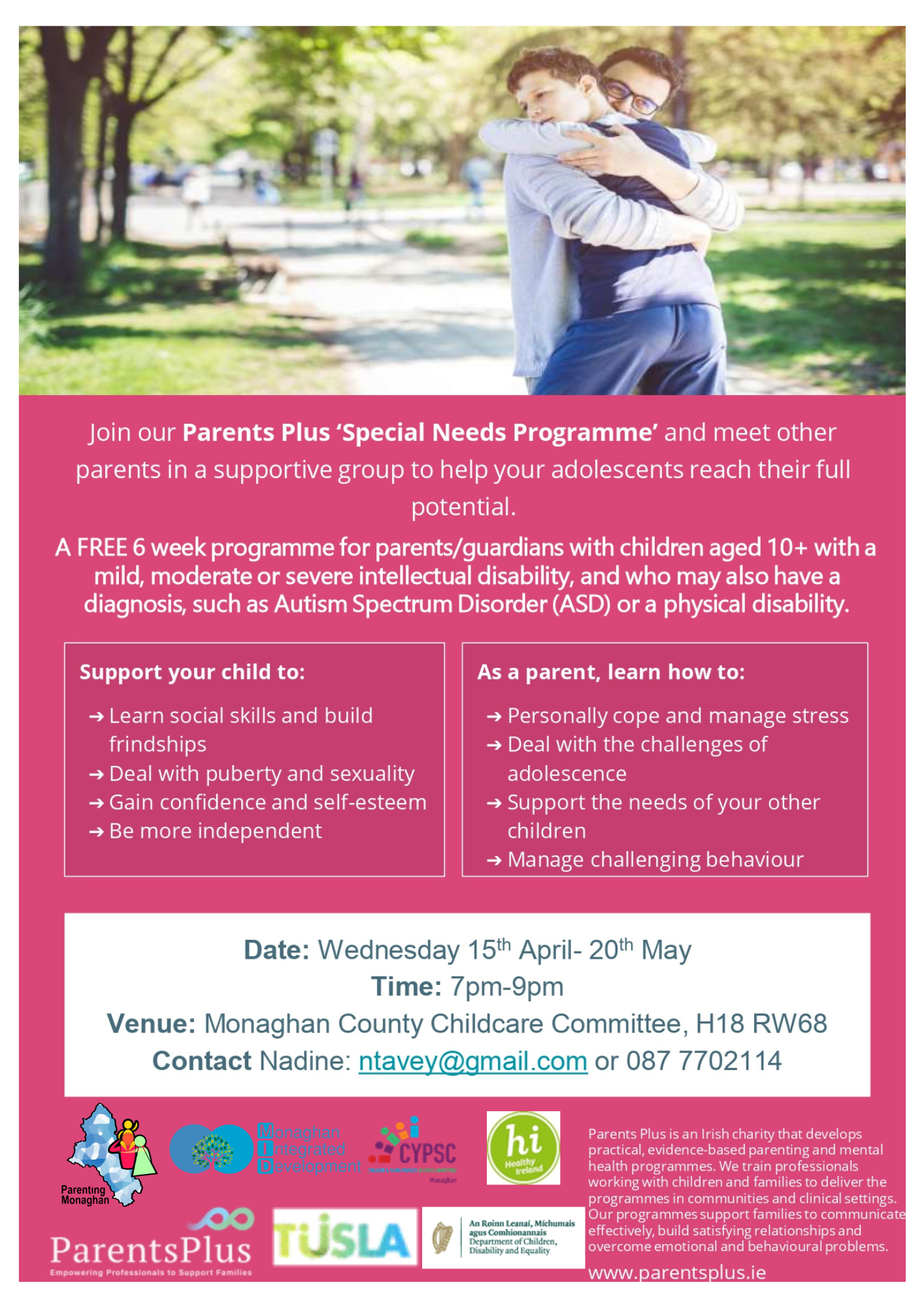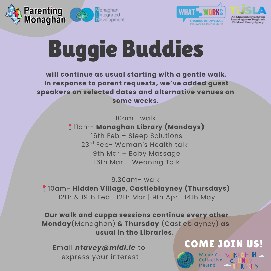 Parenting Monaghan is a partnership hosted by Monaghan Integrated Development which brings together parent support agencies from across the county to co-ordinate parenting programmes and supports. Established in 2017, Parenting Monaghan benefits from a collaborative approach to the provision of parent supports in the county. Its steering group is drawn from representatives from a broad range of services and backgrounds involved in supporting parenting at different stages and ages.